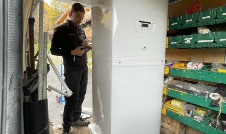 Maël s’apprête à décharger une nouvelle chaudière gaz Saunier Duval DuoMax Condens, avec Romain et Patrice pas loin pour prêter main forte 💪 . Elle viendra remplacer la vieille chaudière de notre client. Une belle installation en cours sur la station pour un confort optimal cet hiver !🔥