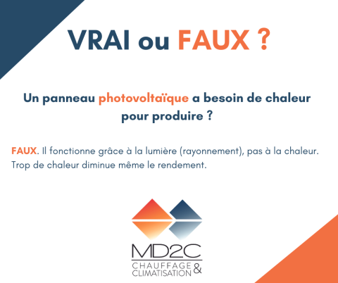 ❌ FAUX : Il fonctionne grâce à la lumière (rayonnement), pas à la chaleur. Trop de chaleur diminue même le rendement.