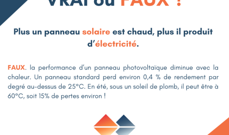 ❌ FAUX ! Au contraire, la chaleur fait baisser les performances d’un panneau photovoltaïque. En moyenne, il perd 0,4 % de rendement par degré au-dessus de 25°C. En plein é...